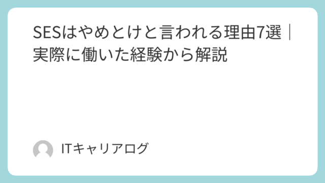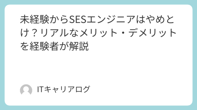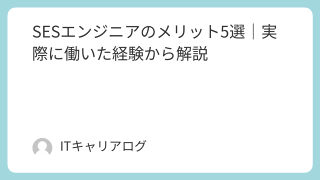 「SESエンジニアはやめとけ」と言われることもありますが、実際にはメリットも多くあります。私は営業2年SESインフラエンジニア3年という経験があります。この記事では、実際にSESエンジニアとして働いた経験からSESエンジニアのメリットIT業...